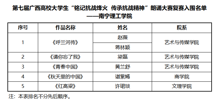 第七届广西高校大学生“铭记抗战烽火 传承抗战精神”朗诵大赛复赛入围名单揭晓