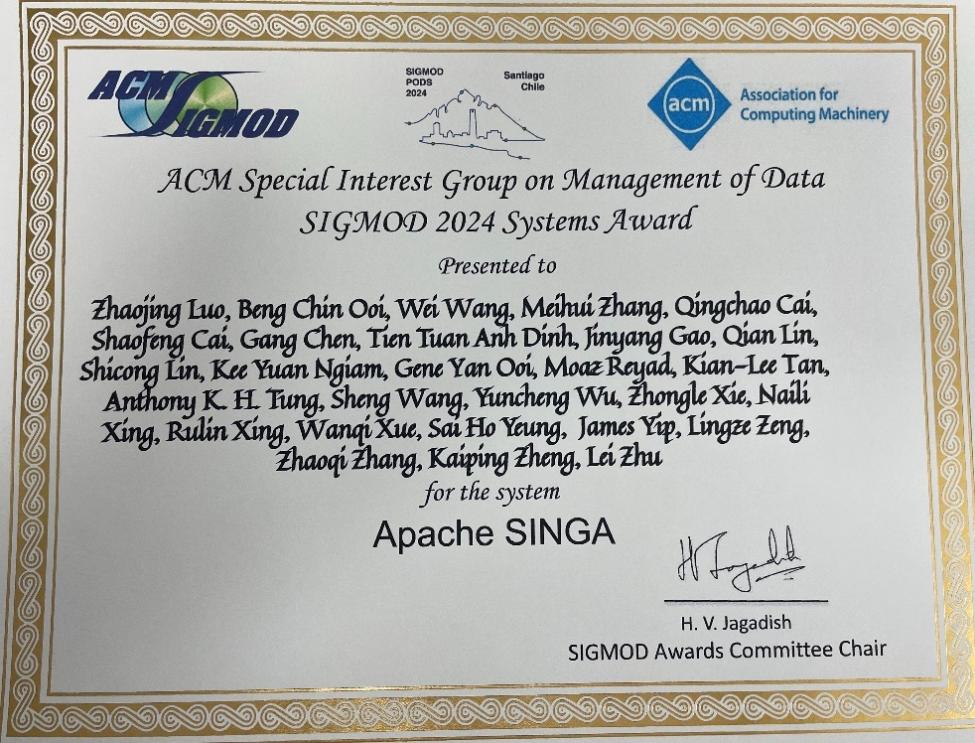 6月9日到6月15日于智利圣地亚哥召开的ACM SIGMOD 2024会议上,国际计算机学会(ACM)宣布将2024年ACM SIGMOD Systems Award授予Apache SINGA项目研发团队,以表彰其在研发分布式、高效、可扩展且易于使用的深度学习平台以用于大规模数据分析方面的贡献。主要获奖人员包括我校万象城娱乐awc线路教授张美慧、罗兆经。