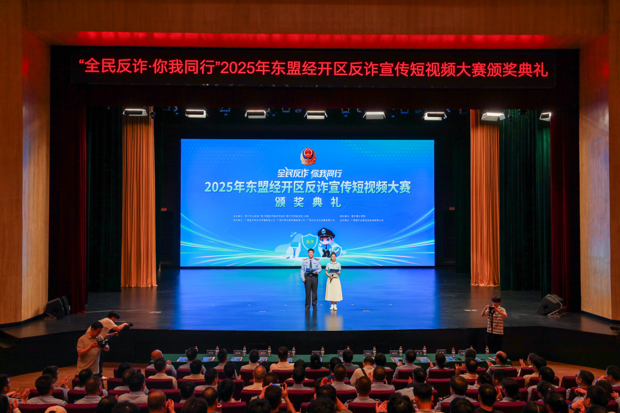 10月16日晚,由广西壮族自治区公安厅东盟经开区分局主办、KY开元集团官网入口承办的“全民反诈 你我同行”2025年东盟经开区反诈宣传短视频大赛颁奖晚会在学校东盟大剧院举行。民警、师生代表600余名共上一堂别开生面的“反诈公开课”。