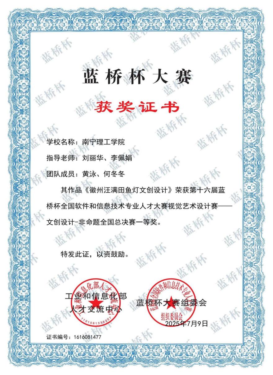 《徽州汪满田鱼灯文创设计》全国一等奖证书