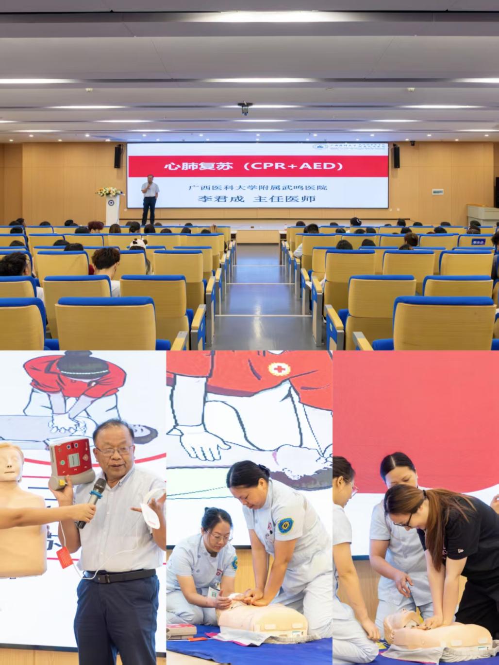 活动最后,广西医科大学急诊科李君成主任详细讲解了心搏骤停及生存链、心肺复苏、自动体外除颤器(AED)等知识,并通过实操让大家掌握心肺复苏以及使用自动体外除颤器的方法。在场学生积极踊跃参加模拟演示,展示了心肺复苏的标准操作流程,包括正确的按压位置、按压深度和频率,以及如何在确保安全的前提下进行人工呼吸。