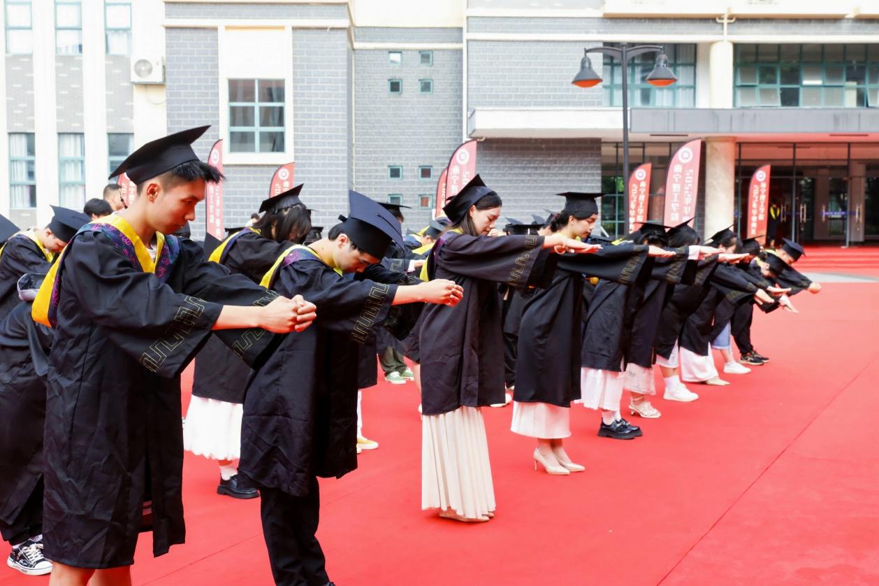 9时整,首先进行的是谢师礼,这是一场充满感恩与传承的礼赞。全体毕业生代表面向导师,深深鞠躬三次,分别感谢导师的悉心教导、关怀陪伴和殷切期望。导师代表随后送上毕业寄语,话语温暖真挚,如阳光照亮学生前路,激励他们坚守初心、追求卓越。此刻,感恩与传承交织,师生情谊升华。