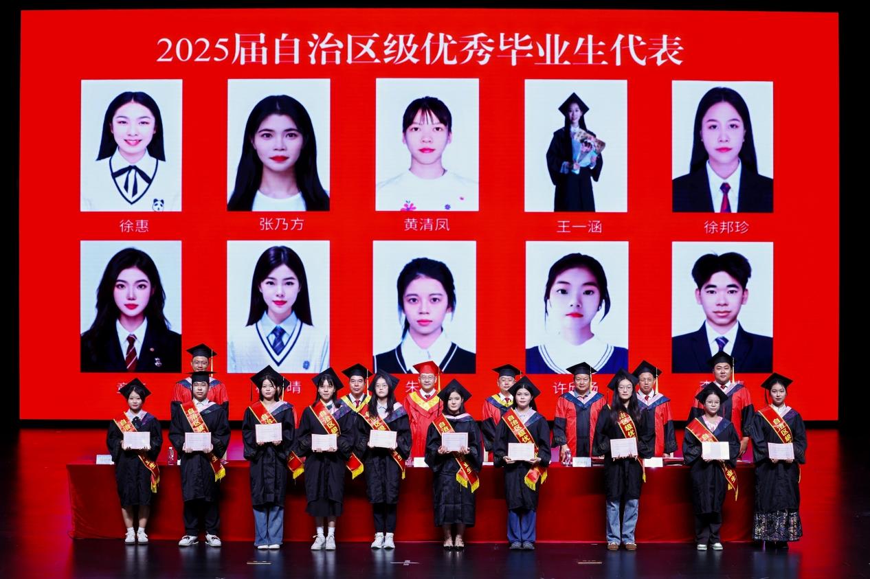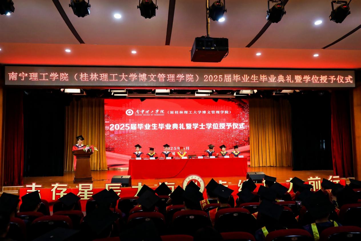 毕业典礼在庄重的国歌声中拉开帷幕。校长王金叶、副校长杨鲜丽宣读了《关于授予林兆阳等6031位同学学士学位的决定》;副校长韩乔,校长助理马纪涛宣读了2025届自治区级优秀毕业生及校级优秀毕业生的表彰决定;副董事长冯正垚、校长助理郑方兵宣读了 2024届“考研先锋”优秀学子表彰决定;学校学位评定委员会成员为优秀毕业生代表、“考研先锋”优秀学生代表颁发荣誉证书,为校友联络员代表颁发聘书,为毕业生代表颁发图书馆阅读纪念册。