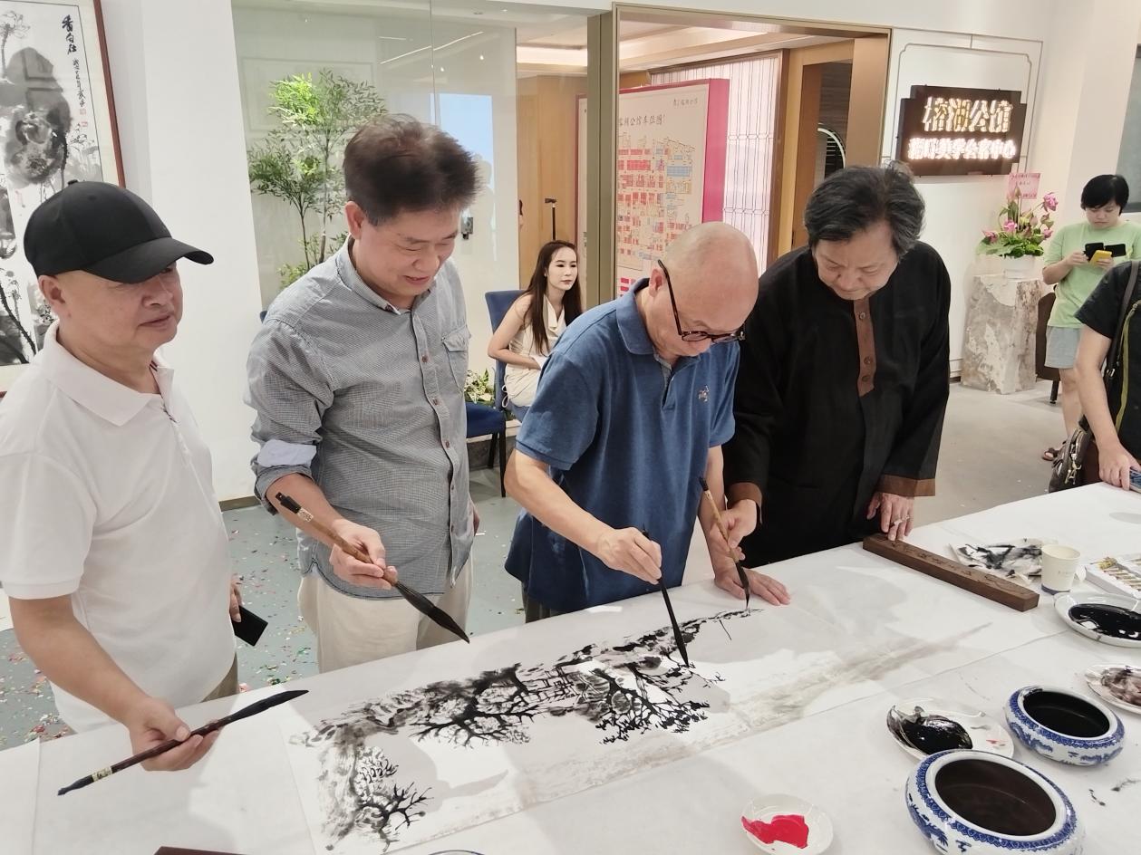展览特别设置"宋式美学体验区",嘉宾可漫步于榕湖公馆的江南园林,在曲径回廊间感受画作与实景的虚实相生。眼前的亭榭湖光,正与画中的荷韵遥遥呼应;历史的屋檐与当代的艺术光影在此重叠,茶歇区以宋代点茶技艺待客,烘托出“一山一水一画,一情一景一趣的武丹彩墨世界之画中游”的沉浸式氛围。