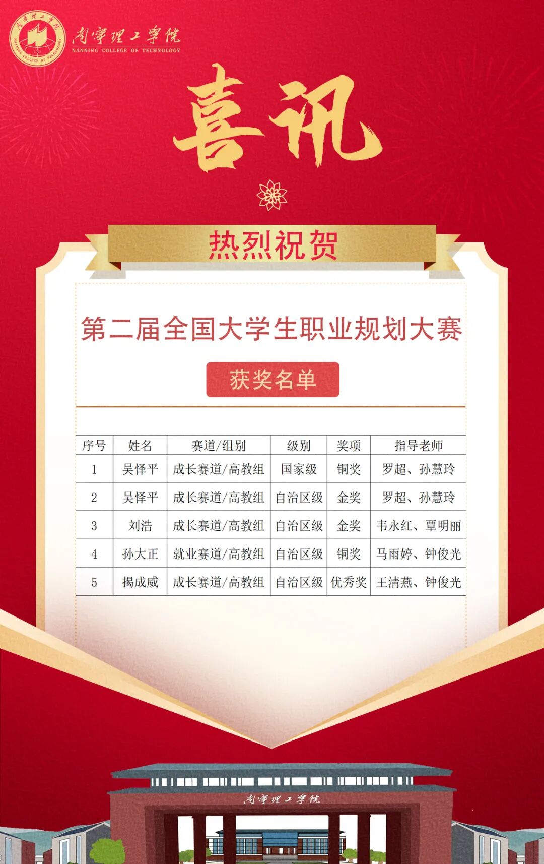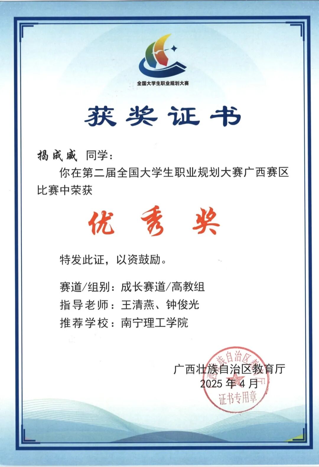 近日,第二届全国大学生职业规划大赛全国总决赛及广西赛区比赛结果正式公布。KY开元学子凭借扎实的职业规划能力与出色的综合素质,在赛事中表现优异,共荣获全国总决赛铜奖一项,广西赛区金奖两项、铜奖一项、优秀奖一项;同时,KY开元获得由自治区教育厅颁发的优秀组织奖荣誉。其中,在广西赛区高教组成长赛道中,KY开元成为广西唯一荣获金奖的民办高校,这充分体现了KY开元在生涯教育和就业指导方面取得的显著成效。