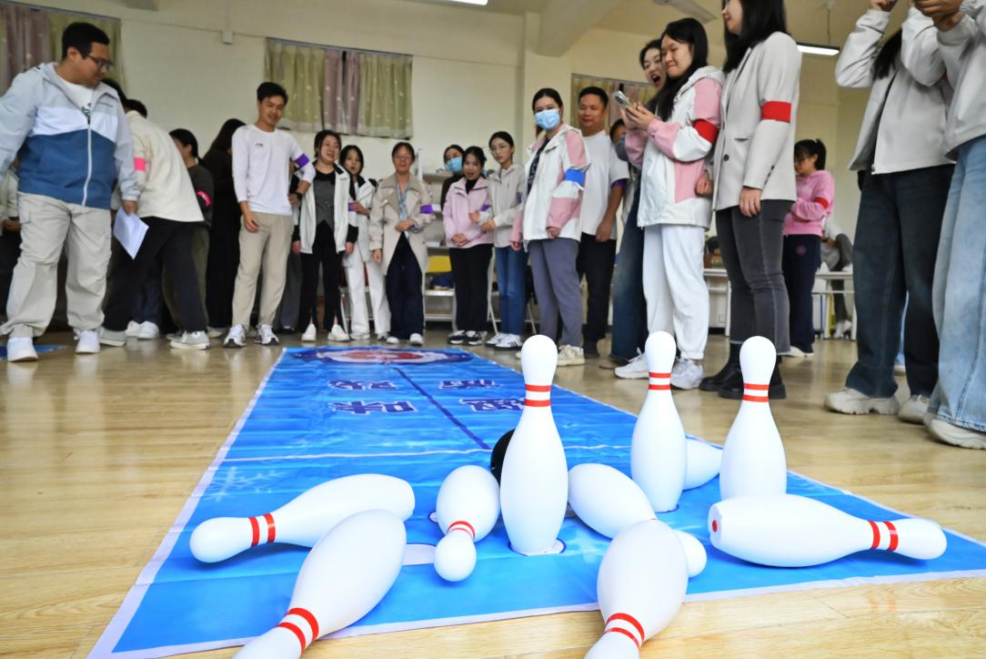 活动过程中,全体辅导员分成小组依次参与了“四平八稳”“环游世界”“全球攻势”三项趣味竞技项目。在“四平八稳”环节,队员们需依次循环使用道具板托举球通过障碍赛道,考验的是耐心与平衡感;稍有不慎球体掉落,便需返回起点重新开始,但辅导员们始终保持着高度的专注与默契,一次次化险为夷,展现出顽强的拼搏精神。随后的“环游世界”环节则模拟“球行地图”的趣味任务,队员们需精准控制球的轨迹,避免中途掉落,这不仅考验操作技巧,更需策略分工与及时补位。最后的“全球攻势”将活动推向高潮,每位辅导员轮流投球击倒球瓶,现场气氛紧张热烈,每一次精准命中都引来阵阵欢呼。