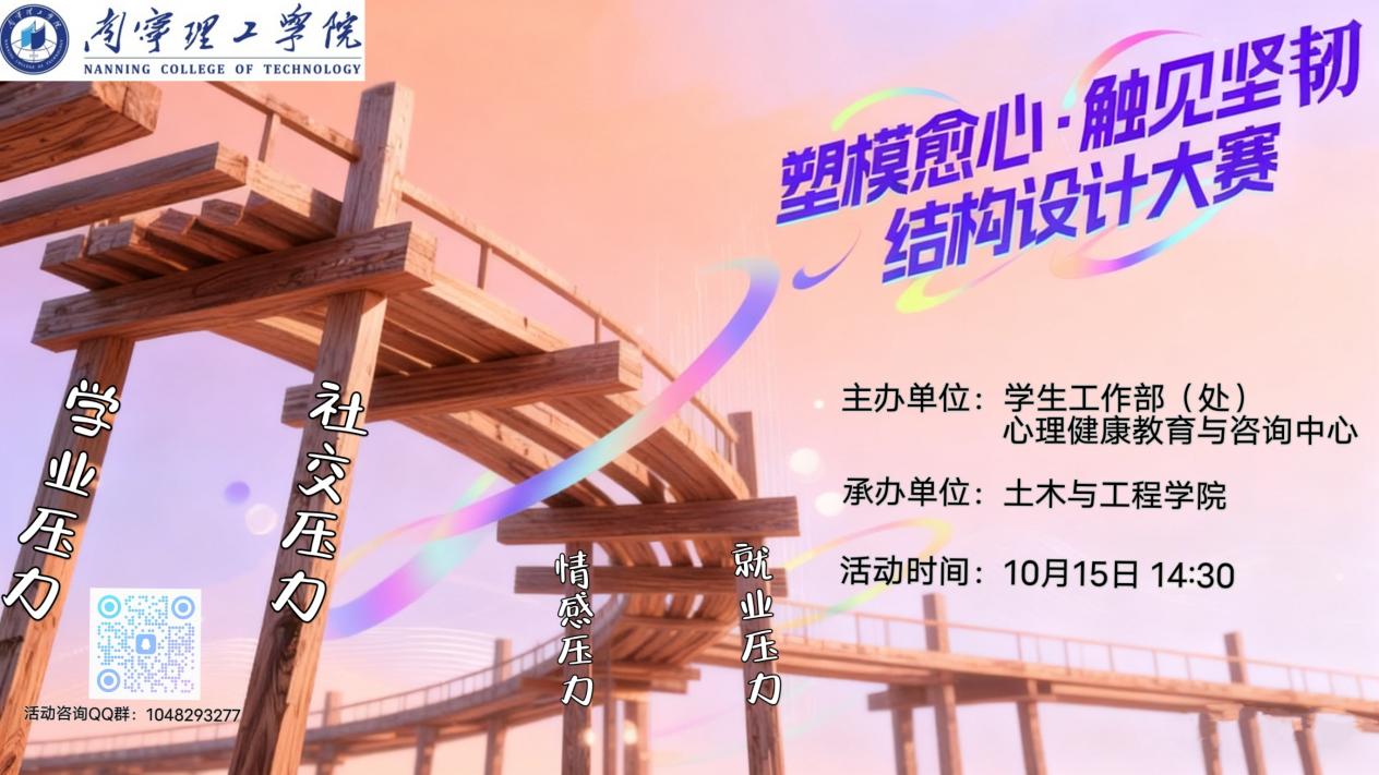 2025年10月15日下午,由学生工作部(处)心理健康教育与咨询中心主办、土木与工程学院承办的“塑模愈心·触见坚韧”结构设计大赛在一教1307教室顺利举行。本次活动将结构设计与心理健康教育深度融合,以“工程实践+心理实验”的双模块闯关形式,引导学生在动手实践中感悟心理韧性,提升压力管理能力。