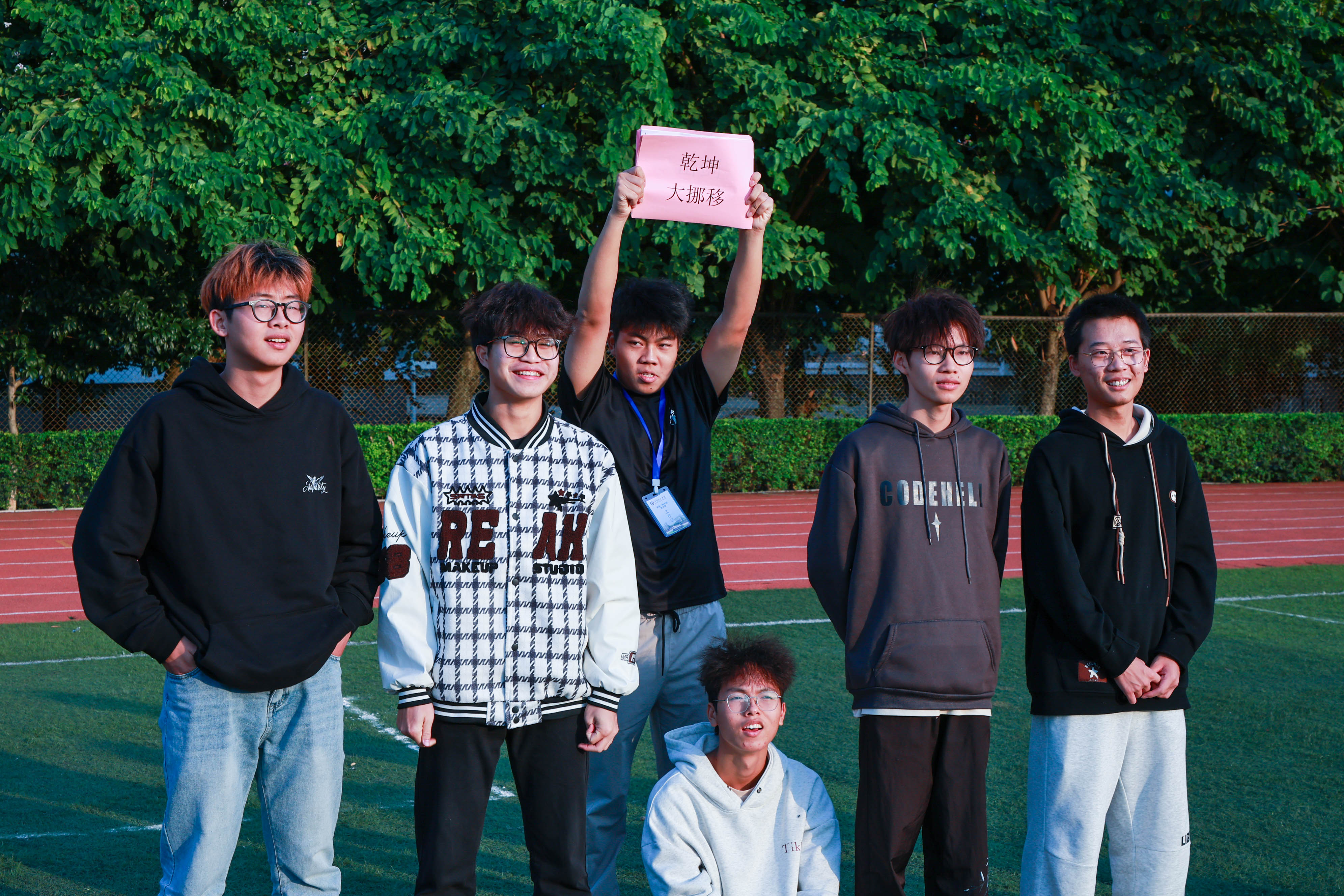 破冰环节后,紧张刺激的团队积分赛将活动推向高潮。本次团辅共设计了三个经典团队合作项目:“你比划我猜”考验了成员间的默契与沟通技巧,夸张的肢体语言引发阵阵笑声;“穿越火线”则需要团队成员精密协作与信任,以巧妙方式在不越线的情况下取回水瓶;最后的“背靠背运球”环节,队员们化身“横行”的螃蟹,小心翼翼地夹球往返,展现了出色的协调与配合;整个竞赛过程既充满竞技的乐趣,又洋溢着互助友爱的温暖氛围,足球场回荡着同学们的加油声与欢笑声。