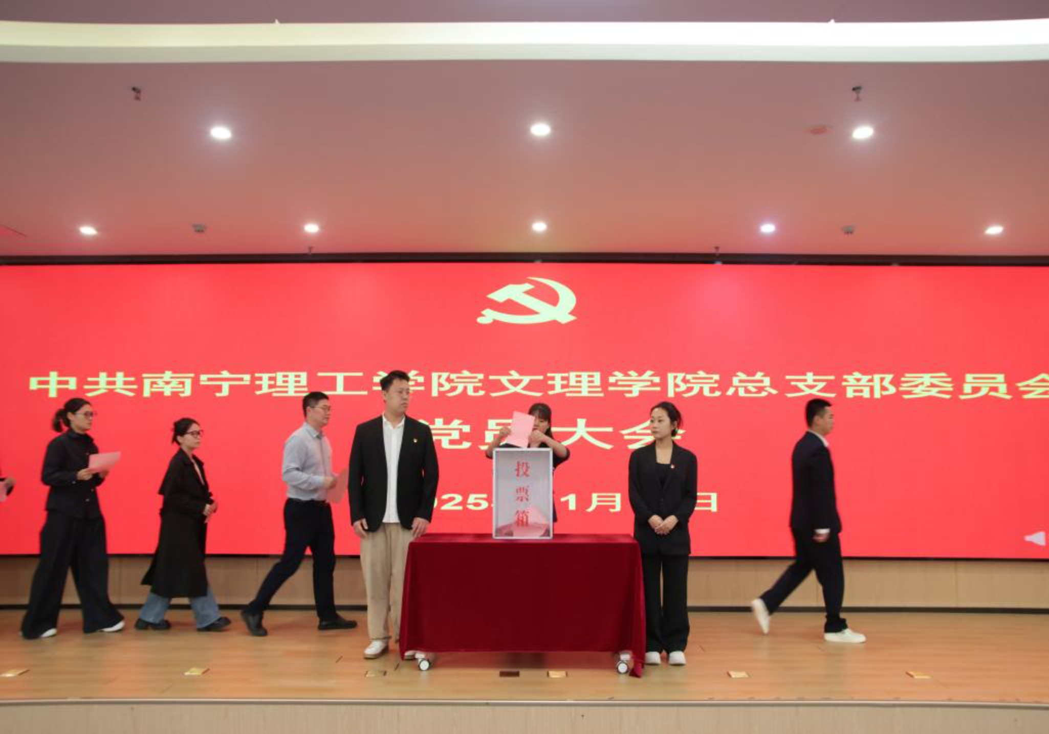 在充分发扬民主的基础上,与会党员以无记名投票方式,选举产生了由仝广凯、甘狄辉、孙宝会、覃远清、覃学鹏组成的新一届文理学院总支部委员会。