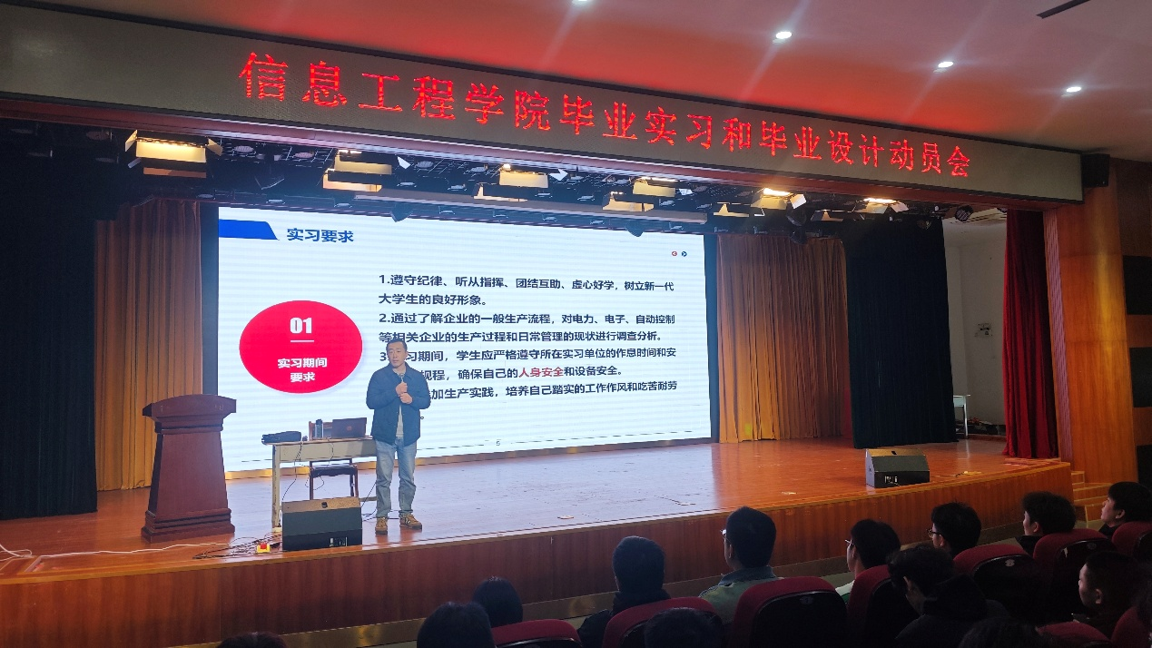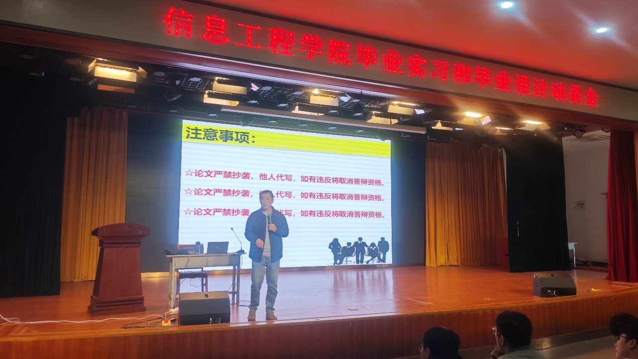 动员会上,闫世伟老师首先介绍了毕业实习的具体安排,并重点强调实习期间的安全事项,指出“安全是第一要义”。闫世伟老师还就实习过程中需要提交的记录材料、注意事项及成果作业等内容作了详细说明。随后,闫世伟老师围绕毕业设计(论文),详细讲解了各阶段的时间节点、具体任务及最终成果要求等,特别强调论文的原创性,坚决杜绝抄袭和代写行为。