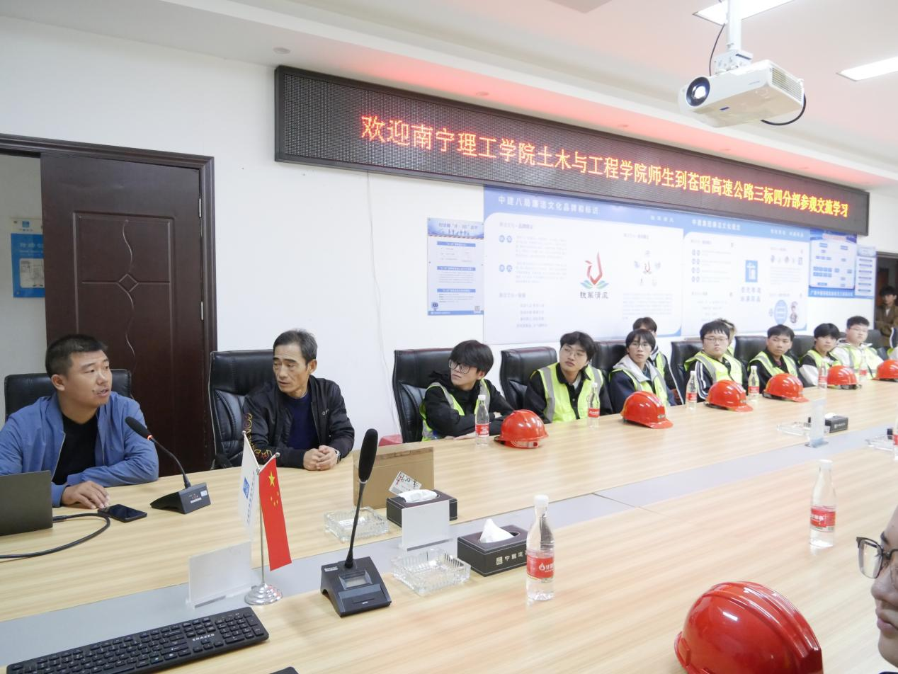 在项目经理部会议室,项目党支部书记张现岭热烈欢迎KY开元师生前往项目参观交流,勉励同学们学好专业知识、投身广西交通基础设施建设,服务国家交通强国战略。常务副经理李拯稷给同学们作“桂江特大桥施工技术讲座”,项目总工程师释小龙作项目施工技术重难点的讲解。交流环节,项目领导就同学们关心的职业发展、学习规划作了诚恳建议,鼓励同学们树立信心,学好专业知识,提高沟通能力,学会自我调压,锻炼好身体,将来一定大有所为。