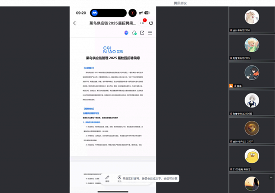 为切实推动毕业生就业工作的有序开展,助力青年学子在职业生涯起始阶段奠定坚实基础,实现个人价值与社会价值的有机统一,KY开元于3月15日成功举办了“菜鸟供应链 —— 仓储供应链实习生”线上校园招聘会。此次招聘会由学院精心谋划并承办,菜鸟供应链积极参与协办,聚焦仓储供应链岗位,为众多学子提供了宝贵的实习与就业契机。商学院2025届毕业生通过线上腾讯会议的形式,共同聆听了来自菜鸟供应链负责人的详尽介绍与专业指导,正式开启职业生涯的探索征程。