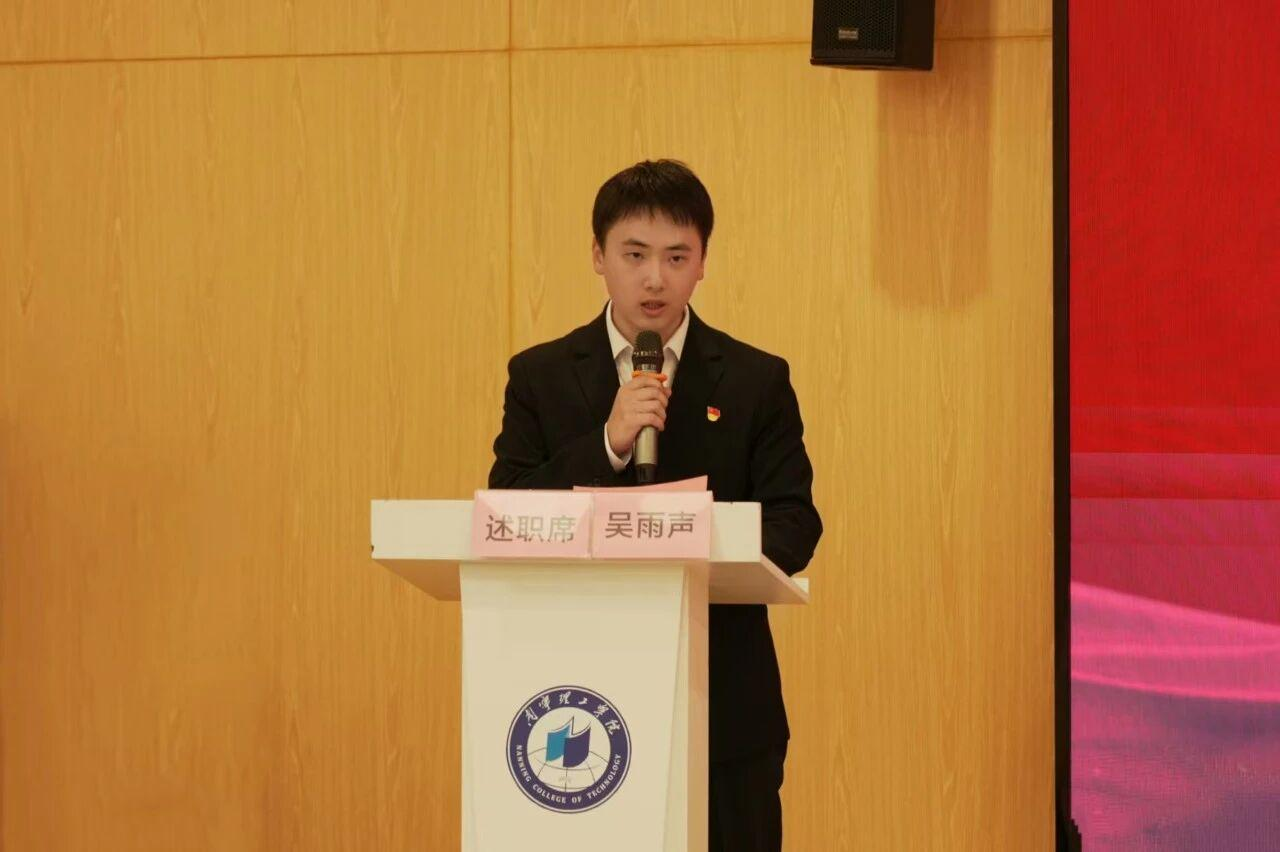 大会在庄严的氛围中拉开序幕。各学生组织负责人依次登台,作年度工作述职,首先述职的是学院团委、学生会代表——团委学生副书记、执行主席吴雨声。他以“引领、服务、成长”为核心,系统汇报了过去一年团学组织在思想引领、服务育人等方面的工作。体现了团学工作与专业特色的深度融合。