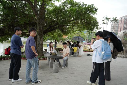 师生分组前往南宁市人民公园,围绕“公园20分钟效应”展开多元采访。在自然层面,学生们采访园艺工作人员,了解珍贵花卉的培植技术与生态价值;文化层面,通过与游客交流,记录公园作为城市“精神绿洲”对居民生活的影响,一位退休教师提到:“每天来公园散步20分钟,既能感受自然,又能遇见老友,这是都市里的‘慢时光’。”