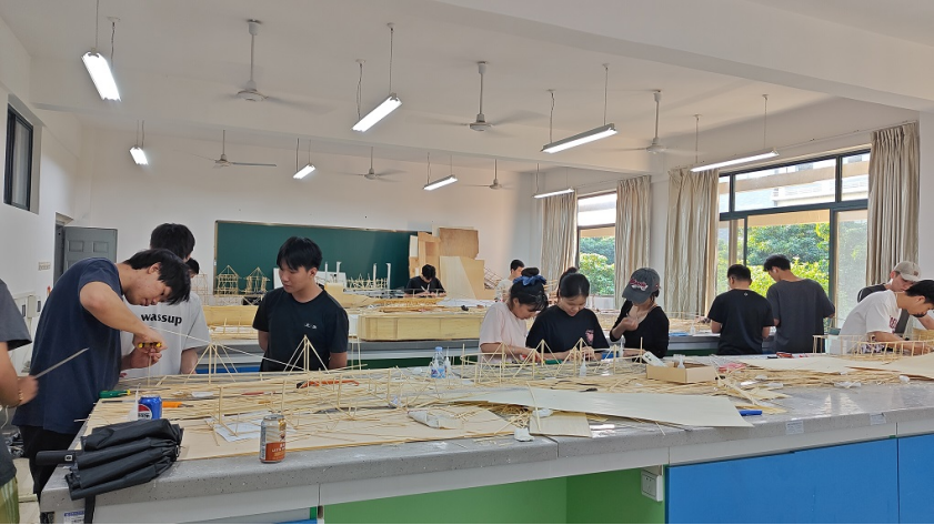 本次竞赛题目为《乌篷船模型结构设计与制作》,要求参赛团队在限定时间内,利用竹条竹皮等轻质材料,设计并制作一艘符合力学性能的乌篷船模型,并通过静载、波浪动载测试检验其承重能力和稳定性。赛题灵感来源于江南水乡传统乌篷船的结构特色,既考验学生对结构力学、材料特性的理解,又需兼顾美学与实用性,体现了“传统文化+工程技术”的融合创新。竞赛自3月15日启动以来,得到了同学们的积极响应,历时两个多月,共有来自土木工程、智能建造、工程管理、工程造价、地理信息科学、计算机科学专业共39支队伍117人报名参赛,经模型合理性评审、初步加载测试筛选27支队伍进入三级加载竞赛环节。