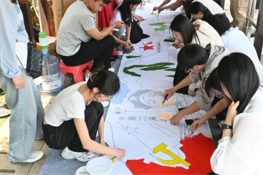 微党课结束后,提前精心绘制好线稿的巨型画布在空地上徐徐铺展,党员同志拿起画笔,在调色盘上蘸取着色彩,落在画布上,赋予色彩与灵魂。巨型画布前,是一幅充满活力与激情的创作场景,每一个人都全身心地投入到这场红色艺术创作中,用画笔诉说着对历史的敬意、对精神的传承。