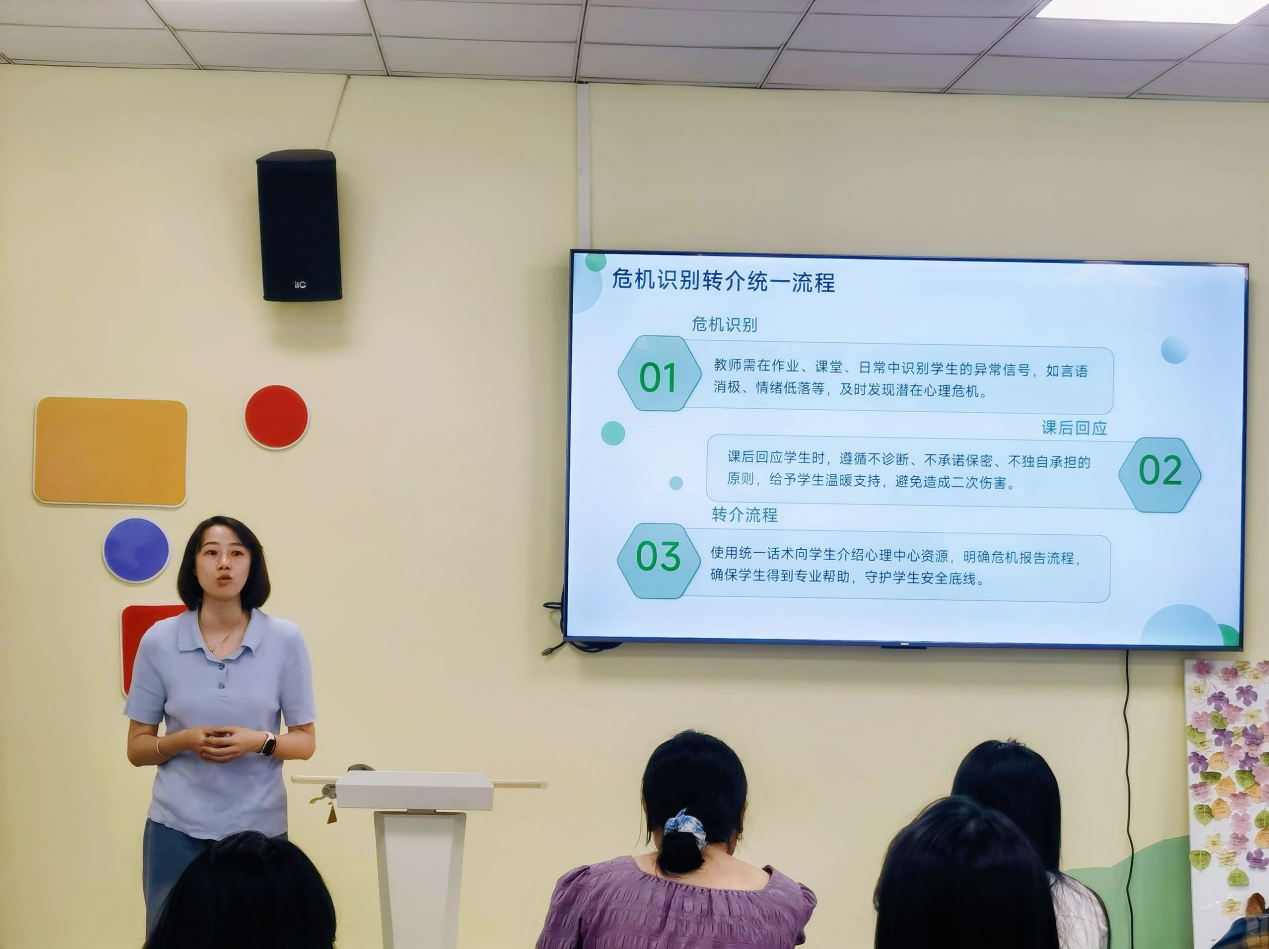 宁世杰老师就课程设置与授课重难点进行了简要介绍,并以说课形式分享了教学实践;罗雪老师针对心理危机突发事件的处置流程及应对策略作了具体讲解,助力应对实际教学中可能遇到的挑战;梁成龙老师则通过答疑环节,与在场教师共同探讨如何提升心理健康教育课程的授课质量。