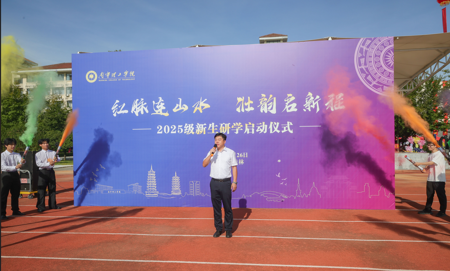 副董事长冯正垚,党委副书记、副校长韩乔分别为南宁东盟校区及桂林雁山校区各学院新生代表授旗。当象征着研学精神与青春使命的旗帜稳稳交到新生代表手中时,不仅传递着学校对学子们深入实践、探寻真知的殷切嘱托,更凝聚着传承红色基因、弘扬壮乡文化、践行科技自强的责任担当。