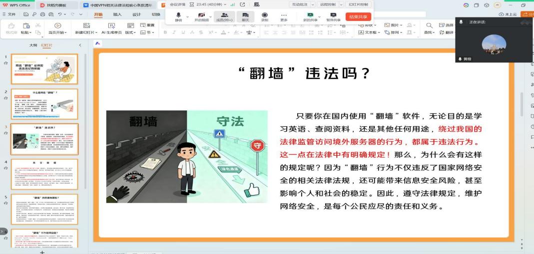 班会上,辅导员结合当前网络环境特点,重点讲解了网络“翻墙”的违法性和潜在危害,引导学生远离此类行为。也通过真实案例剖析了网络诈骗、信息泄露、不良信息传播等常见网络安全风险、学生虚假兼职、游戏账号交易、冒充熟人等针对学生群体的诈骗手法,提醒同学们要自觉遵守国家法律法规和加强自我保护意识,不尝试“翻墙”访问境外网站,以免触犯法律,影响自己的学业和前途,注意保护个人隐私,不轻易透露个人信息给陌生人,安装可靠的安全软件,定期更新病毒库,确保个人设备安全。