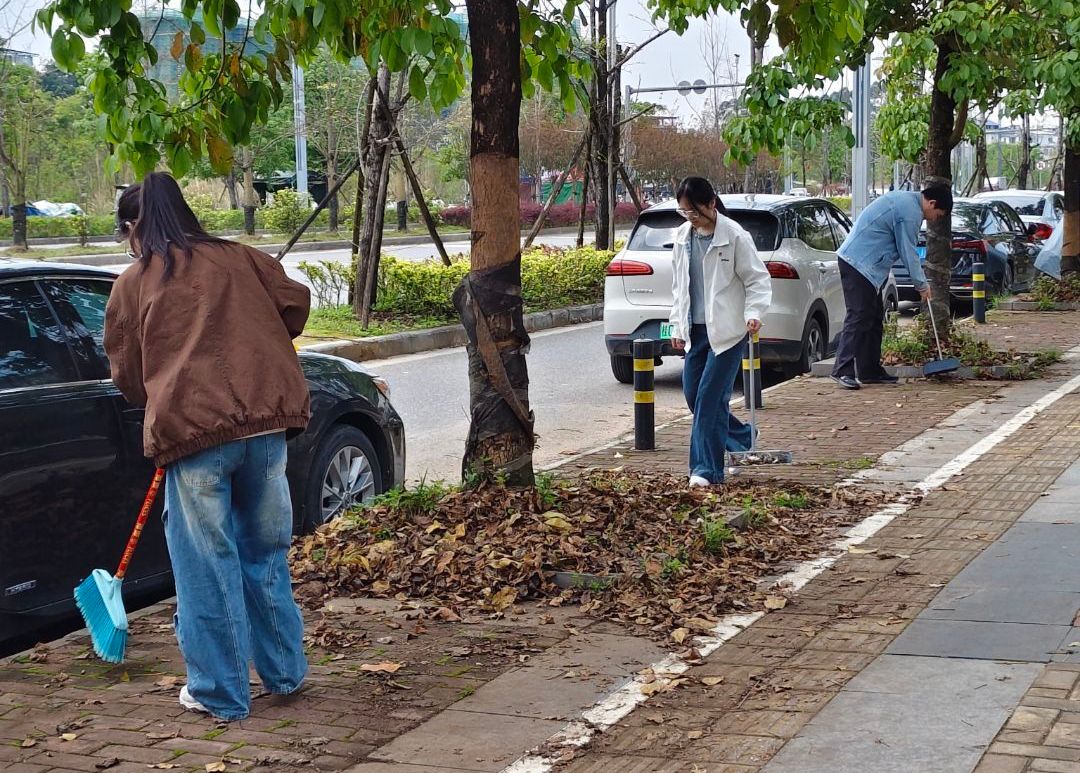 活动当日,阳光和煦,春意盎然。学院41期入党积极分子精神饱满、斗志昂扬,统一分为5个志愿小组,明确分工、协同作战。其中3个小组沿着校园周边道路、绿化带开展集中清扫,大家手持扫帚、夹子、垃圾袋等工具,不放过任何卫生死角,仔细清理路面落叶、白色垃圾与杂物堆积,用汗水净化校园周边环境,为师生营造整洁有序的出行空间。